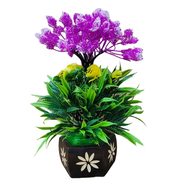 DVMART® Violet Flower with Green Leaf With Hexagon Wooden Pot for Decoration (17x25 CM)